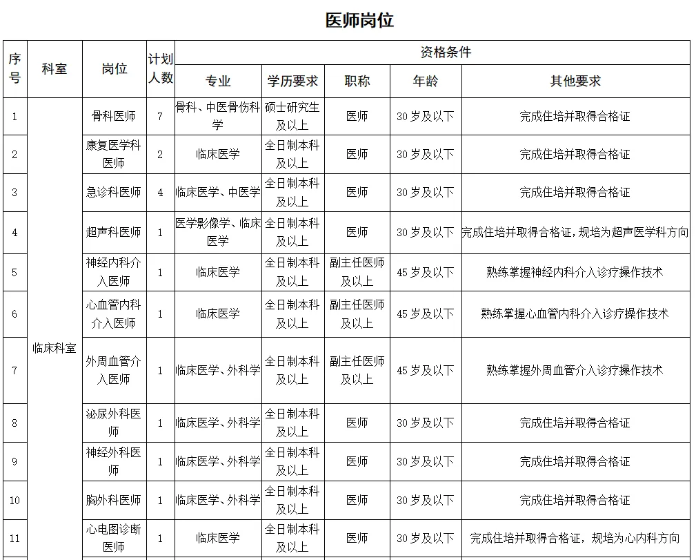 2.條件要求:具備碩士研究生及以上學歷(部分緊缺專業(yè)可放寬至本科學歷),年齡不超35歲;專業(yè)理論功底扎實,業(yè)務技術過硬,有良好的團隊合作精神;有二級甲等及以上醫(yī)院工作5年及以上經歷,并有三級甲等醫(yī)院進修6個月及以上經歷。