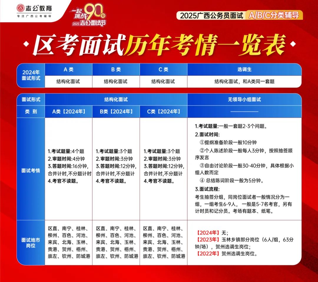 志公教育還給大家整理了廣西區(qū)考面試ABC歷年考情一覽表,幫助大家有效備考: