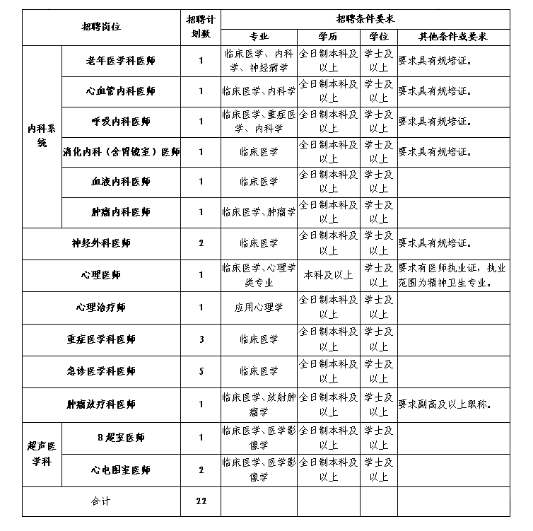 注:初中級(jí)職稱應(yīng)聘人員原則上年齡要求為35周歲及以下;如為副高以上職稱,年齡可放寬至45周歲;學(xué)歷層次高者優(yōu)先。醫(yī)師崗位中如要求具有規(guī)培證條件的是指已取得規(guī)培合格證書(含通過規(guī)培結(jié)業(yè)考試未領(lǐng)合格證書)或已取得中級(jí)及以上職稱人員。