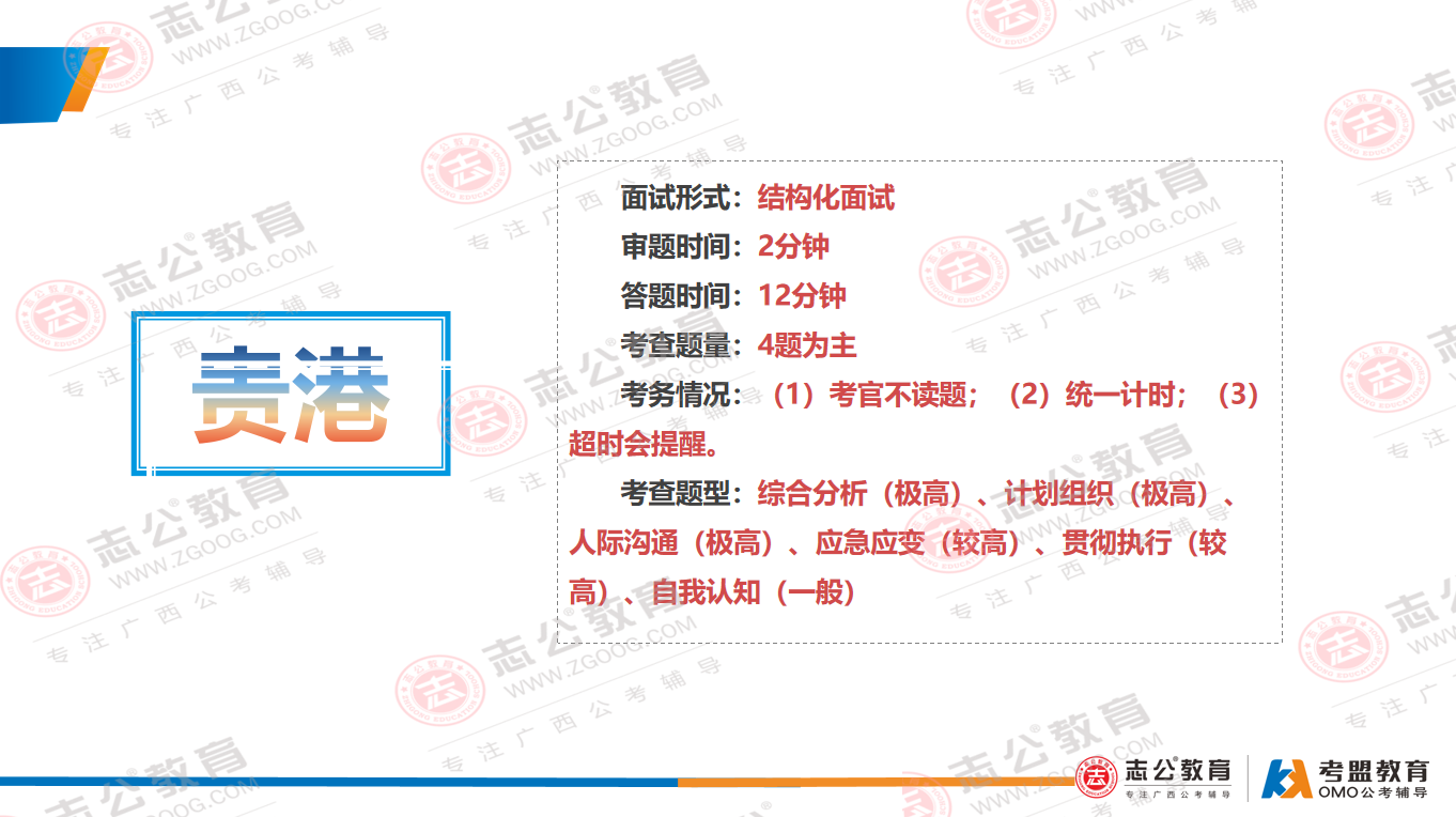貴港事業(yè)單位面試主要采用結(jié)構(gòu)化面試形式;審題時間:2分鐘;答題時間:12分鐘;考查題量:4題為主。考務(wù)情況:考官不讀題、統(tǒng)一計時、超時會提醒??疾轭}型:綜合分析(極高)、計劃組織(極高)、人際溝通(極高)、應(yīng)急應(yīng)變(較高)、貫徹執(zhí)行(較高)、自我認知(一般)。