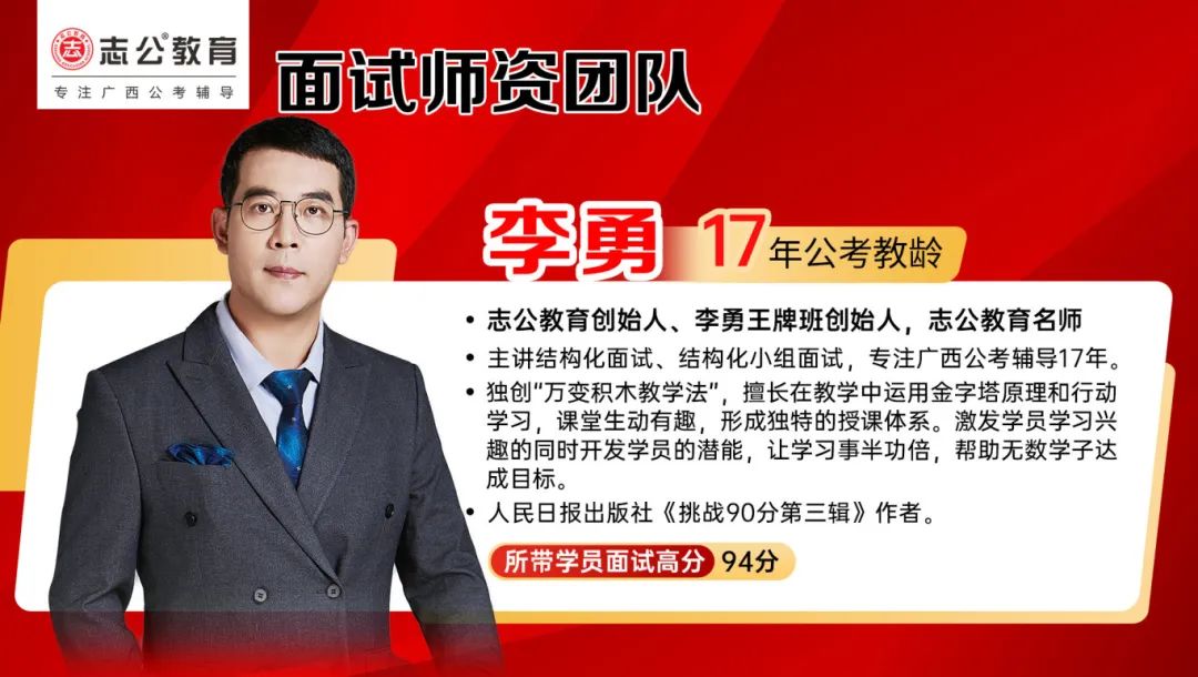 李勇——志公教育創(chuàng)始人、李勇王牌®班創(chuàng)始人,志公教育名師。主講結構化面試、結構化小組面試,專注廣西公考輔導17年。獨創(chuàng)“萬變積木教學法”,擅長在教學中運用金字塔原理和行動學習,課堂生動有趣,形成獨特的授課體系。激發(fā)學員學習興趣的同時開發(fā)學員的潛能,讓學習事半功倍,幫助無數(shù)學子達成目標。同時也是人民日報出版社《挑戰(zhàn)90分第三輯》作者。