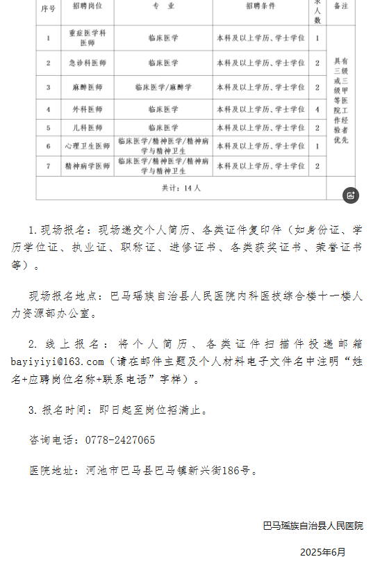 巴馬瑤族自治縣人民醫(yī)院2025年人才招聘公告