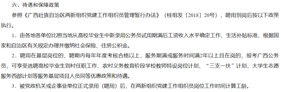 如果是符合條件的黨員朋友可要抓住這次機(jī)會(huì)了??,不僅“由各地各單位比照當(dāng)?shù)貜母咝.厴I(yè)生中新錄用公務(wù)員試用期滿后工資收入水平確定工作、生活補(bǔ)貼標(biāo)準(zhǔn),根據(jù)國(guó)家和自治區(qū)有關(guān)規(guī)定辦理并繳納社會(huì)保險(xiǎn)、住房公積金。”服務(wù)期滿還參照三支一扶等服務(wù)基層項(xiàng)目人員同等優(yōu)惠政策和待遇,而且!這個(gè)考試只用筆試,不用面試,香,實(shí)在是太香了!