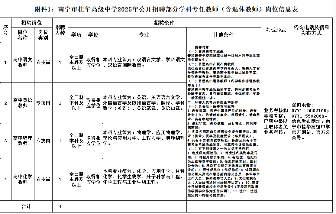 附件1:《南寧市桂華高級中學(xué)公開招聘專任教師(含退休教師)崗位信息表》