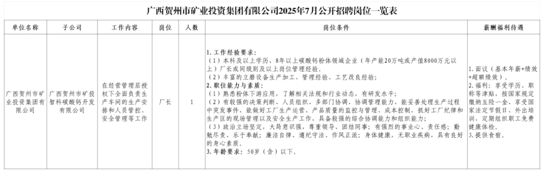 1.廣西賀州市礦業(yè)投資集團有限公司2025年7月公開招聘崗位一覽表