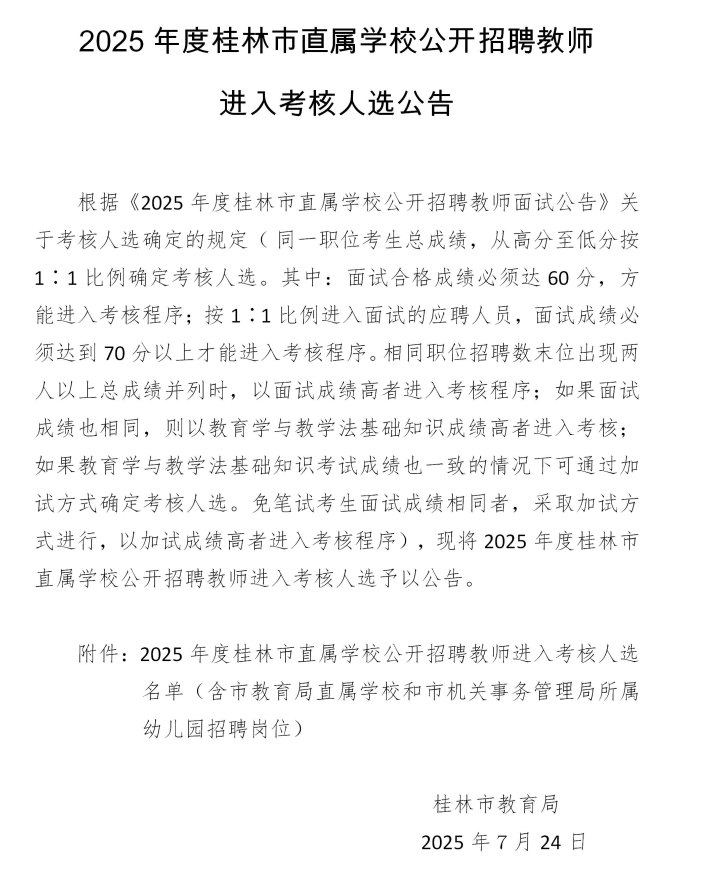 2025年度桂林市直屬學校公開招聘教師進入考核人選公告