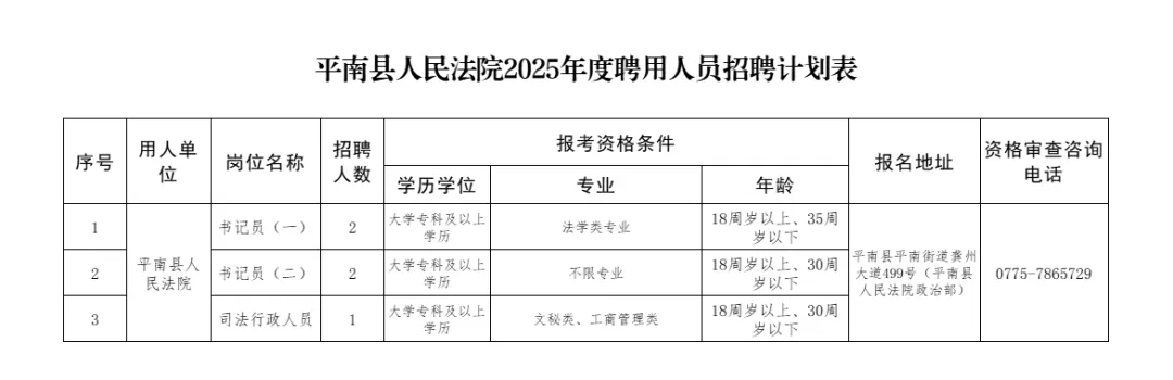 本次招聘崗位為書(shū)記員4名,司法行政人員1名。詳見(jiàn)附件1《平南縣人民法院2025年度聘用人員招聘計(jì)劃表》(以下簡(jiǎn)稱《招聘計(jì)劃表》)。